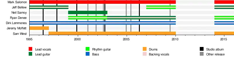 They signed to Tooth & Nail Records because The Crucified was on the label and Salomon enjoyed working with the label owners.[3][4] The band soon got to work on its debut album, Friction, which was released on June 7, 1996. After the album's release, Moffett left the band and was replaced by former Scaterd Few drummer Sam West. The following year, they released Absolutes. AllMusic reviewer Stephen Thomas Erlewine gave the album four out of five stars, saying the lyrics didn't stand out to him but "the sound is so heavy and foreboding that the lack of strong writing becomes a moot point."[5] Following the release of Absolutes, Ryan Dennee joined the band as a second guitarist. Bellew soon departed to focus on his marriage; however, he recorded additional guitars for the band's next album.[6][7]