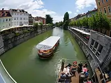 The property changed hands repeatedly until the first half of the 12th century. The territory south of the Sava where Ljubljana developed, gradually became property of the Carinthian Dukes of the House of Sponheim.[40] Urban settlement started in the second half of the 12th century.[40] At around 1200, market rights were granted to Old Square (Stari trg),[41] which at the time was one of Ljubljana's three original districts. The other two districts were an area called "Town" (Mesto), built around the predecessor of the present-day Ljubljana Cathedral at one side of the Ljubljanica River, and New Square (Novi trg) at the other side.[42] The Franciscan Bridge, a predecessor of the present-day Triple Bridge, and the Butchers' Bridge connected the walled areas with wooden buildings.[42] Ljubljana acquired the town privileges at some time between 1220 and 1243.[43] Seven fires erupted during the Middle Ages.[44] Artisans organised themselves into guilds. The Teutonic Knights, the Conventual Franciscans, and the Franciscans settled there.[45] In 1256, when the Carinthian duke Ulrich III of Spanheim became lord of Carniola, the provincial capital was moved from Kamnik to Ljubljana.