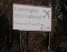 Despite Llandegley having no airfield—much less one of international standard—a visitor to Llandegley, Nicholas Whitehead, erected his own road sign, mimicking the UK's standard Worboys signs, on private land on the north side of the A44 east of Crossgates in 2002, showing "Llandegley International [Airport] / Terminals 1 & 3 / 2½ m".[1][2] He spent £1,000 on renting the site.[2][4]