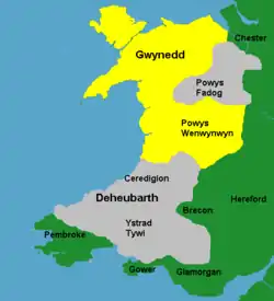 Wales c. 1217. Yellow: areas directly ruled by Llywelyn; Grey: areas ruled by Llywelyn's client princes; Green: Anglo-Norman lordships.