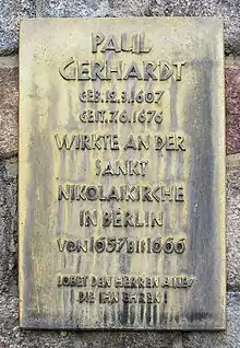 {{cite book}}:|work=ignored (help) - Memorial plaque for Paul Gerhardt at the Nikolaikirchplatz, Berlin-Mitte.