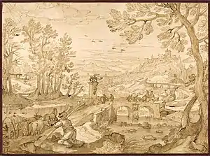 Toeput's drawings show his interest in topography. His Panorama of Treviso and View of Aquapendente were engraved and included in volume V (1598) of Georg Braun and Frans Hogenberg's six-volume atlas, the Civitates orbis terrarum (Cologne, 1572–1618). He also created imaginary landscapes, such as the Landscape with St John on Patmos (New York, Pierpont Morgan Library), showing his characteristic trees with windswept foliage framing a finely detailed panorama depicted from a high viewpoint.[7] Many of his drawings depict landscapes including urban views and often feature bridges. Usually, cities and landscapes occupy most of the space while the human figures are of small scale. The cities are typically characterized by high towers. The landscapes are mountainous and suggest distance. He often placed an object such as a tree on the left or right side of his drawings in order to link the front and back of the composition. An example is the Landscape with Heracles and the Ox-Driver (Hermitage. Moscow). His urban views recall those of the Venetian Domenico Campagnola.[21]