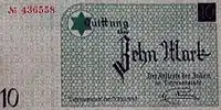 Lodz Ghetto mark (German: Mark, Polish: Marka getta łódzkiego) was a surrogate currency that circulated in the Lodz Ghetto in 1940—1944 until the Ghetto was liquidated in August 1944. It was divided into 100 pfennig (German: pfennig). The notes had no value outside the Ghetto, and could not be exchanged into other currencies.