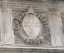 The Loggia was erected by the Pope Pius II in honor of his family, whose Palazzo Piccolomini (delle Papesse) stands nearby on Banchi di Sotto, where it converts into Via di Pantaneto, that runs on the lower flank, to the left when facing the loggia. To the right is the baroque church of San Martino. The frieze reads Gentilibus suis Picolomineis (Family of Piccolomini). The design is attributed to Antonio Federighi. Construction began in 1462, and was completed within the year. The Via di Pantaneto flank of the loggia has a series of heraldic shields with the Piccolomini emblems, five supine crescent moons on a cross.[1]
