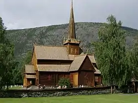 Lom Stave Church, which is located in Fossbergom, is believed to have been built in 1158, making 2008 the 850th anniversary. It was enlarged in 1634, with further addition of two naves in 1667. It is believed that the church was originally surrounded by a circumambulatory passage, like many other Norwegian stave churches, but that this passage was removed when the two side wings were added. A few Runic inscriptions can be still be seen in the church. The church also contains numerous paintings from the 17th and 18th centuries with religious motifs. Many of the paintings were made by local artist Eggert Munch, a distant relation of the famous Edvard Munch. The church also contains numerous examples of local woodcarving, as seen in the elaborate acanthus scrolls adorning the pulpit. Carved dragon figures on the roof are old symbols of protection against evil. It is still in use as the local church.