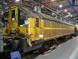 The metadyne-fitted locomotives had new bodies, but the bogies and motors were removed from redundant Metropolitan line stock and refurbished at Acton Works. Similarly, the metadyne equipment was removed from an experimental train and reused. A metadyne unit consists of a rotating machine, which converts the constant voltage supplied by the battery to a constant current, which feeds the motor. The metadyne system is more efficient than conventional starting resistances, particularly when the locomotive starts and stops frequently, or when it needs to run for long periods at slow speeds. For cable laying work, the metadyne-equipped locomotives could pull trains of 100 tons at 3 mph (5 km/h) for considerable distances, without any sign of overheating. Despite the advantages, their complexity resulted in them becoming unreliable, and they were withdrawn in 1977.[7] L41 and L42 were scrapped soon afterwards, but L43 was used for testing purposes for a further three years.[8]