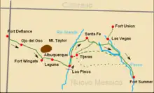 Hostilities escalated between European Americans and Navajos following the scalping of respected Navajo leader Narbona in 1849.[6] In August 1851, Colonel Edwin Vose Sumner established Fort Defiance for the U.S. government (near present-day Window Rock, Arizona) and Fort Wingate (originally Fort Fauntleroy near Gallup, New Mexico). Prior to the Long Walk, treaties were signed in 1849, 1858, and 1861.[note 1]