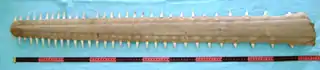 A combination of characters are necessary to distinguish it from the other sawfish species: the longcomb sawfish has teeth to near the base of the rostrum or "saw" (unlike the knifetooth sawfish, Anoxypristis cuspidata), 23–37 teeth on each side of the rostrum (18–24 in the dwarf sawfish, P. clavata, 20–32 in smalltooth sawfish, P. pectinata, and 14–24 in largetooth sawfish, P. pristis),[note 1] the teeth towards the tip of the rostrum are clearly closer to each other than those at its base (unlike the dwarf, smalltooth and largetooth sawfish where either equally spaced or only marginally closer to each other towards the tip of the rostrum), a relatively narrow rostrum, width equalling 9–17% of its length (typically wider in dwarf and largetooth sawfish), a rostrum that is 23–33% of the total length of the fish (20–25% in dwarf sawfish), relatively short pectoral fins (unlike the knifetooth and largetooth sawfish), a leading edge of the dorsal fin that is located clearly behind the leading edge of the pelvic fins (in front of in largetooth sawfish and roughly above in smalltooth sawfish) and it has a very small or no lower tail lobe (present in knifetooth and largetooth sawfish).[4][10] It can be further separated from the two most similar species, the dwarf and smalltooth sawfish, by the considerably smaller maximum size of the former species, and the less greenish colour (when alive/recently dead) and essentially Atlantic distribution of the latter species.[4][6] The smalltooth and longcomb sawfish might historically have come into contact in South Africa, but sawfish appear to have been extirpated from this country.[11][12]