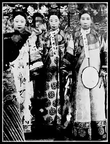 ![]() Qing Empress dowager (left) and Empress (middle) wearing longhua collar, Qing dynasty,1900. | |||||||