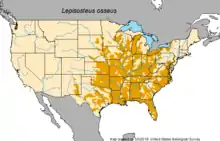 The most common prey of longnose gar are small fish and occasionally insects and small crustaceans; they mostly feed at night.[16] In most studies of adult L. osseus, a variety of species made up a majority of the diet, with the dominant prey changing among locations. Inland silversides were particularly common prey of juvenile gar in Lake Texoma, making up 84% of the diet, with gamefishes accounting for less than 1% of the diet.[17] In Florida, their diet consisted mainly of fishes, with gizzard shad, bullhead catfish, and small bluegill particularly common.[18] In Missouri, fishes made up 98% of the diet with shiners being the most common prey.[19] In some lakes, adult longnose gar may consume large numbers of sunfish. Menhaden are a major food source along coasts where L. osseus moves towards the mouths of bayous into higher-salinity waters in the afternoon and evening to find this more prevalent prey. Longnose gar then move back up the bayous, into the lower-salinity waters in the morning.[20] Their main competitors are other garfishes, and somewhat commonly, large gar to feed on smaller ones.[21] Historically, Native Americans and early colonists harvested longnose gar as a main food source.[22] Over time, longnose gars have gained in popularity as a sportfish rather than as a food source, but some people consider gar meat a delicacy. Adult longnose gar are considered apex predators in their aquatic habit, and have few predators, which include humans and in the southern reaches of their range the American alligator.[5] They are most vulnerable to predation when they are young, and are preyed upon by other garfishes, larger fishes, birds of prey, snapping turtles, and water snakes.[23]