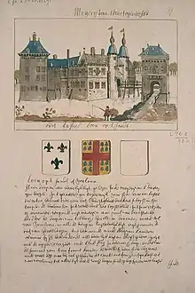 The Eighty Years' War had meanwhile started in 1568. Loon op Zand Castle became part of a front line that covered 's-Hertogenbosch, and in 1579 it got a garrison from that city.[14] On 24 June 1587 the Dutch army under Philip of Hohenlohe-Neuenstein moved through the Langstraat, and bombarded Loon op Zand castle with 5 guns. The castle surrendered after a week long siege, with the keep suffering much damage. After the surrender the garrison begged for mercy. The captains were slaughtered, the soldiers taken prisoner, and the wives stripped naked. The latter then went to 's-Hertogenbosch with their children and told their story.[15]