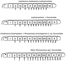 Segmentation of Lophoturus madecassus (top) compared to other millipedes of order Polyxenida