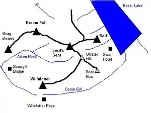 The principal feature of these fells is a ridge running from the Vale of Lorton in the west to Bassenthwaite Lake in the east. Travelling in this direction the main tops are Graystones, Broom Fell, Lord's Seat and Barf. Barf is in truth a satellite of Lord's Seat but was given the status of a separate fell by Alfred Wainwright in his influential Pictorial Guide to the Lakeland Fells[1]