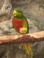 Loriini is a tribe of small to medium-sized arboreal parrots characterized by their specialized brush-tipped tongues for feeding on nectar of various blossoms and soft fruits, preferably berries.[1] The species form a monophyletic group within the parrot family Psittaculidae. The group consists of the lories and lorikeets. Traditionally, they were considered a separate subfamily (Loriinae) from the other subfamily (Psittacinae) based on the specialized characteristics, but recent molecular and morphological studies show that the group is positioned in the middle of various other groups. They are widely distributed throughout the Australasian region, including south-eastern Asia, Polynesia, Papua New Guinea, Timor Leste and Australia, and the majority have very brightly coloured plumage.