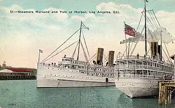 The Yale and Harvard, sister ships launched in December 1906 and January 1907 and both triple-screw steamers capable of a speed in excess of 20 knots, were to make up the fleet, expected to arrive in July 1920 from the Atlantic coast.[7] After arrival in Los Angeles both ships were to undergo a $1,000,000 repair and alteration program.[8] On August 24 the merger with the Los Angeles Pacific Navigation Company was announced and the size of the fleet was increased to 6.[9] A new $100,000 terminal next to Shed 1, Pier A was built for the daily service between San Pedro and San Francisco. The terminal was reachable by Pacific Electric rail from 6th & Main Station in downtown Los Angeles.[10] Eventually there was $8,000,000 spent on Yale and Harvard by the time they were ready for their first journey,[11] the job was performed by the Los Angeles Shipbuilding and Dry Dock Company.[12] The two ships were thereafter referred to as luxury liners on every occasion. According to their entries in Lloyd's register, this overhaul neither changed the principal dimensions of the ships by more than mere inches nor did it involve a replacement of the 3 steam turbines. The duration of the journey between San Pedro and San Francisco was 18 hours, i.e. overnight.[13] The service was inaugurated with the departure of Yale from San Pedro at 3 p.m. on May 2, 1921,[14] Harvard left San Pedro on August 5 for her first run.[15]