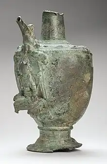 Early examples of lota and kindi first appear in Chalcolithic period cultures of South Asia, notably in Savalda Culture and two well-preserved examples from Jorwe culture pottery dating back to 2nd millennium BC.[2][6] Highly decorative spout vase with floral motifs are also known from Chandraketugarh dating back to 2nd century BC to 1st century CE.