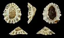 The very strong ribs at the outside and the curiously marked interior, like the print of a hand, are prominent characteristics of this species.[3]