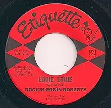 In 1959, Roberts left the Bluenotes and began singing with another local band, the Wailers, famed for their "hard-nosed R&B/rock fusion".[61] Known for his dynamic onstage performances, Roberts added "Louie Louie" to the band's set and, in 1960 recorded the track with the Wailers as his backing band.[62] The arrangement, devised by Roberts with the band, was "the first-ever garage version of 'Louie Louie'"[62] and included his "one of the true great moments of rock"[37] ad-lib "Let's give it to 'em, RIGHT NOW!!" Released as a single on the band's own label, Etiquette, in early 1961, it became a huge hit locally, charting at No. 1 on Seattle's KJR and establishing "Louie Louie" as "the signature riff of Northwest rock 'n' roll".[63] It also picked up play across the border in Vancouver, British Columbia, appearing in the top 40 of the CFUN chart. The popularity of the Roberts release effectively buried another "reasonably close to the Richard Berry/Ron Holden arrangement"[37] version put out at about the same time by Little Bill Englehardt (Topaz T-1305).[62]