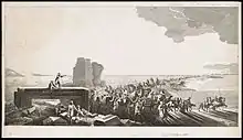 From 1784 to 1786, Cassas lived and worked at the French embassy.[1] In 1784 he accompanied the Count Choiseul-Gouffier, the French Ambassador to the Ottoman Empire, on his mission to Constantinople. Commissioned by him, he travelled from 1784 to 1787 engaged in making drawings for the Ambassador's second volume of Voyage pittoresque de la Grèce, published in 1809.[4] He visited Egypt from October to December 1785, and drew the antiquities of Alexandria, the pyramids of Giza and the mosques of Cairo.[3] Shortly afterwards he made several drawings of Palmyra, in the desert of Syria, visited the Holy Land and illustrated the ruins of Baalbec in Lebanon.[4] He also painted Palestine, Cyprus and Asia Minor, drawing ancient Middle Eastern sites, many of which had never been recorded.