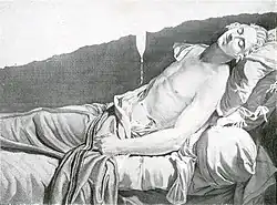 On 20 January 1793, the eve of the king's execution, Le Peletier was assassinated in a restaurant in the Palais Royal.[3] His murderer, Philippe Nicolas Marie de Pâris, a member of the Garde du Corps, entered the restaurant, approached Le Peletier, and said "You voted for the King's death, Monsieur Le Peletier?" Le Peletier replied, saying "I voted according to my conscience. What has that to do with you?" Pâris proceeded to plunge a saber that he had hidden under his cloak into Le Peletier's chest. Pâris was able to leave the restaurant with no resistance from its patrons.[4] Pâris fled to Normandy, where, on the point of being discovered, he supposedly shot himself in the head.[3] Other sources claim the real murderer fled to England where he died years later.
