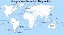 On 15 September 1763, Bougainville set out from France with the frigate L'Aigle (Eagle) (captained by Nicolas Pierre Duclos-Guyot) and the sloop Le Sphinz (Sphinx) (captained by François Chenard de la Giraudais).[4] This expedition included the naturalist and writer Antoine-Joseph Pernety (known as Dom Pernety), the priest and chronicler accompanying the expedition, together with the engineer and geographer Lhuillier de la Serre.[5]