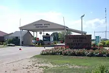 The main entrance is at the terminus of Louisiana Highway 66, a road described by Wolfe and Lornell as "a winding, often muddy state road".[21] From St. Francisville one would travel about 2 miles (3.2 km) north along U.S. Highway 61, turn left at Louisiana 66, and travel on that road for 20 miles (32 km) until it dead ends at Angola's front gate.[59] The Angola Ferry provides a ferry service between Angola and a point in unincorporated Pointe Coupee Parish. The ferry is open only to employees except during special events, when members of the general public may use it.[60]