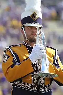 The band continues to be a celebrated part of the university community; some members report being asked for autographs.[9] The current look of the band has been memorialized in a set of 17 miniature, hand-painted figurines that includes the different members of the band and that sells for almost $400.[10][11] One group of fans has even chosen to memorialize the band's Pregame performance by creating shirts with the first four notes of the band's fanfare.[12] On Saturday, October 11, 2008, ESPN announced that the Tiger Band won first place in a competition amongst university bands from Auburn, Clemson, Florida, Georgia, Texas, and USC. Each band played a version of John Williams's Indiana Jones theme, and ESPN posted the videos online for fans to vote.[13] At halftime during the 2009 home football game against Vanderbilt, the band was inducted into the Louisiana Music Hall of Fame. In 2010, the LSU Golden Girls performed in Hong Kong as part of the Chinese New Year celebration marking the first ever international performance by the Golden Band from Tigerland. In 2012, the LSU Tiger Band was named as one of the "Top Ten College Marching Bands in the United States" by the Huffington Post. The Tiger Band added another international performance In 2014 when all 325 members traveled to Dublin, Ireland to perform in the St. Patrick's Day Parade.