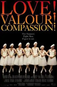 Love! Valour! Compassion! is a 1997 drama film directed by Joe Mantello and written by Terrence McNally, adapted from McNally's play of the same name.[1] It revolves around eight gay men who gather for three summer weekends at a lakeside house in Dutchess County, New York, where they relax, reflect, and plan for survival in an era plagued by AIDS.[2]