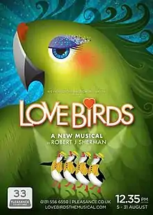 After two short but successful runs of A Spoonful of Sherman, during the recording of the original cast album in December 2014, Sherman turned to Nicholls with the Love Birds concept. Only a few of the songs were complete and a script had yet to be written but Nicholls liked the concept and the songs he had heard. Nicholls suggested veteran Edinburgh producer, Kat Portman Smith to produce. The script and balance of songs were then composed over the next few months with a first draft (one act) book and score completed in June 2015. In the meantime, a poster image was commissioned which would set much of the visual tone of the piece moving forward. The poster was created by Rebecca Pitt. A production team was put together consisting of Designer: Gabriella Slade, Lighting Designer: Rob Mills, Sound Designer: Andy Hinton, Casting Director: Stephen Moore, Stage Manager: Roisin Symes, Production Manager: Simon Streeting. Press Representative Susie Safavi and Social Media Manager: Terri Paddock were also brought in at this point.[4] Originally Music Supervision was being handled by Colin Billing who had worked with Nicholls and Sherman on A Spoonful of Sherman the year before. In late June, Billing had to pull out from the production for personal reasons at which point Musical Director: Richard Healey stepped in to do the music arrangements for the show in just under two weeks. Taking Healey's place as Musical Director was Neil MacDonald. Rehearsals commenced in earnest on July 13, 2015 at The Big Wheel rehearsal space in Exmouth Market, London. London Previews were held on July 28 and 29 at the Lost Theatre in Stockwell. On July 30, the entire Original Cast Album was recorded (in a single day) at Porcupine Studios and mixed over the following two days by Engineer: Nick Taylor. Edinburgh previews began on August 5 with press attending from August 6 onward.[5]