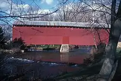 The Loys Station Covered Bridge is a multiple king post wooden covered bridge near Thurmont, Maryland. The bridge was burned by an arsonist in 1991 and rebuilt using surviving framing. The original bridge spanned 90 feet in one span, but has since been modified with a pier at the middle of the span.[2] The bridge crosses Owen's Creek and is surrounded by a park.[3]