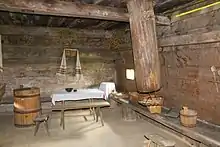 For lighting, luchina is inserted in a crack in the wooden wall or in a special holder called svetets.[1] A small metal svetets may be stuck in a wooden wall. A more elaborate svetets may be manufactured with a stand. A small basin with water is usually placed under the svetets, to collect ashes and coals.