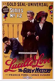 Lucille Love, Girl of Mystery is a 1914 American action film serial directed by Francis Ford. It was the first serial by Universal. It was originally intended to be a short subject. The serial is now considered to be lost with only four episodes surviving.[2] Prints and/or fragments were found in the Dawson Film Find in 1978.[3] The head of the Universal City Zoo, animal trainer Doc Kirby, was mauled by a lion during production and died shortly thereafter from a septic infection of the wound.[4]