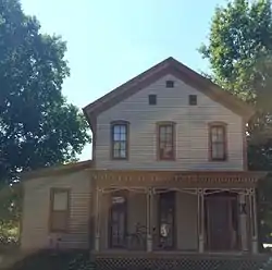 The Lucinda Hunter House is a historic house located at 101 East 8th Street in Vermont, Illinois, United States. The house was built in the early 1870s for Lucinda Hunter, the mother of village postmaster John Hiram Hunter. The house is an example of the Gable Front type of the Side Hall plan, a vernacular style popular for much of the 19th century. The Side Hall plan as exhibited in the house features two rooms on each story connected by a hall to the side; the Gable Front type reflects its roof form, a gable roof with a front-facing gable. Elements of several popular architectural styles decorate the house, such as the Greek Revival entrance, Italianate arched windows, and Gothic pointed arches on the porch.[2]