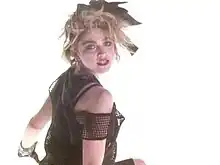 In the video, Madonna wore a black outfit consisting of a mesh crop top, fingerless lace gloves, skirt over leggings, and stars and crucifixes dangling from her ears and around her waist.[69] Although Belle was credited with coming up with the ensemble, biographer Mary Cross noted that Madonna was wearing her "day-to-day" clothing.[65] At the time of the song's release, the singer's fashion was catching on as a statement among club kids and her fans, with the crucifixes she wore as earrings being the most prominent; Madonna herself commented that, "[wearing a crucifix] was kind of offbeat and interesting. I mean, everything I do is sort of tongue-in-cheek. Besides, [the crucifixes] seem to go with my name."[65] Cross, however, wrote that the singer was trying to find a distinctive image for herself, and stand out among artists like Boy George, Cyndi Lauper, and David Bowie.[65] "Lucky Star" was added to MTV the week of June 2, 1984;[70] afterwards, it was added to Madonna's video compilations The Immaculate Collection (1990) and Celebration: The Video Collection (2009).[66][27]