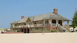 The Ludington State Park Beach House is a two-story square plan building measuring 116 feet (35 m) by 35 feet (11 m).[2] It sits on a concrete foundation, and has red brick walls on the lower story, wooden singles on the upper story, and a cedar shingle hip roof.[3] Three brick archways on the lower floor provide access from the beach house directly to the Lake Michigan beach.
