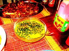 Lugbara cuisine is one of the meals of East Africa and the ancient Lado Enclave. The Lugbara people of northwestern Uganda and northeastern DR Congo eat not only vegetable dishes, but also animals like goats, cows plus ope (guineafowls)[1] and catch insects like onya (white ants /winged termites) for food which is called nyaka in the standard Lugbara language used in Arua. Cassava flour, sometimes mixed with millet or sorghum like posho or ugali, is the staple food and is called enya(sa) (kalo or atap(a) in Ateso, fufu in West Africa) and accompanied with a range of soup dishes. Rice, yams, potatoes (including boiling plus mashing dried mutere) and matoke (steamed or mashed bananas) are also eaten. Below is a list of some of the Lugbara-styled delicacies found in West Nile Restaurants, Ariwara Town (DR Congo), Arua Park in Kampala (Uganda's capital) and many homes or cafeterias that cherish traditional Lugbara cuisine.