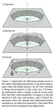 This article incorporates text from this source, which is in the public domain. - Wang, Rebecca; Gehlot, Vinod P.; Bandyopadhyay, Saptarshi; McGarey, Patrick M.; Byron, Benjamin; Pisanti, Dario; Wilson, Ron; Jenks, Kenneth (23 January 2023). "Lift Wire Deployment and Anchoring System for the Lunar Crater Radio Telescope on the Far Side of the Moon". AIAA SCITECH 2023 Forum. American Institute of Aeronautics and Astronautics. doi:10.2514/6.2023-1787. ISBN 978-1-62410-699-6. S2CID 256134317.