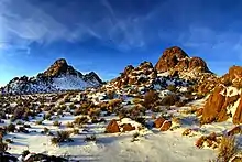 The volcanic field is named after the Lunar Crater vent,[3] the most distinctive vent in the volcanic field.[1] The area is dry and rugged and thus uninhabited.[4] Owing to its diverse geology and accessibility, Lunar Crater volcanic field was used to test prototype Mars rovers[5] and as a training ground for astronauts[6] for the Moon landings.[4] Parts of the volcanic field lie within the Palisade Mesa wilderness study area,[7] and Lunar Crater is classified as a National Natural Landmark, known as Lunar Crater National Natural Landmark.[8]