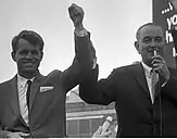 He entered the primaries starting with New Hampshire on March 10. There were no official candidates on the New Hampshire ballot, so both Kennedy and Johnson were write-in candidates.[18]Some Kennedy supporters organized a Kennedy-for-vice-president write-in campaign, which gave him almost 25,000 voted for vice president.[18] He had a four-to-one edge over Hubert Humphrey, his closest opponent.[19] Johnson won New Hampshire with almost 29,000 votes, and Kennedy issued a statement that evening saying that the choice of a vice-presidential candidate should be made by Democratic convention in August, guided by the wishes of President Johnson.[18] Shortly after the primary, Johnson began tossing out names of possible running mates. He initially considered Kennedy's relative Sargent Shriver, but eventually rejected the idea asserting that Shriver's presence on the ticket would still have raised questions about his capacity to win on his own.[20]
