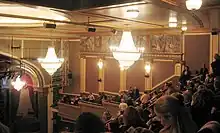 Roger Morgan Studio was responsible for the interior design of the new Lyric Theatre.[40][41] The modern theater's new design elements blend with its historical elements; the design of the lobby was inspired by the old Lyric, while the auditorium was inspired by the old Apollo.[40] BBB initially planned to use a modern decorative scheme that contrasted with the historical design elements, but Richard Blinder said this proposal was "too diagrammatic".[36] Lyres are used as decorative motifs throughout the interior of the new Lyric Theatre.[16] The auditorium also includes furnishings that were constructed specifically for the new theater but were inspired by early-20th-century theaters' decorations.[31] Drabinsky involved himself in many aspects of the new Lyric's design when it was built.[37]