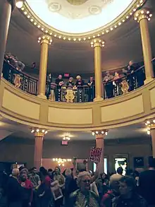 The lobby of the new Lyric Theatre is on the east side of the theater, extending from 42nd to 43rd Street, with an elliptical rotunda on 43rd Street. The floor, dome, columns, and staircases of the rotunda were brand-new elements constructed for the Ford Center.[42] The Italian-marble staircase rises from one side of the rotunda and splits into two flights, wrapping around to the mezzanine.[37][38] At the top of the stair is a medallion of the Greek god Zeus.[10] The rotunda's walls are covered with canvas panels, designed to imitate the look of cut stone.[38][42] Mariuca Brancoveanu designed the rotunda's mosaic floor, which contains depictions of the masks on the original Lyric's facade, surrounded by a mosaic border.[32][38] The mosaic decoration is composed of 172,800 marble pieces covering 650 sq ft (60 m2).[32][37][43] The capitals of the rotunda's columns are decorated with gilded guilloche reliefs that depict light bulbs.[31][38] The dome of the rotunda was taken from the Apollo Theatre and measures 39 by 28 ft (11.9 by 8.5 m).[13][37] The mezzanine level, overlooking the lobby, contains wrought-iron railings with depictions of lyres.[38]