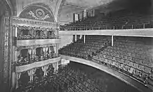 The old Lyric was designed by Victor Hugo Koehler[14][15] and constructed by the Shubert brothers for composer Reginald De Koven.[16][17] It featured performers such as Fred Astaire, the Marx Brothers, and Douglas Fairbanks[9][12] until it was converted to a movie theater in 1934.[18] The exterior of the old Lyric still largely survives within the current theater.[19] The interior decorative scheme was relatively plain.[20][21] The old Lyric contained three levels of seating, topped by a ceiling dome that was surrounded by moldings of lyres and Greek masks.[21] This theater also had 18 boxes.[20]