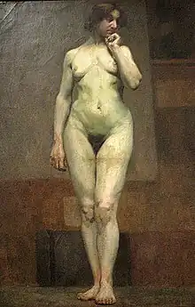 The artist's approach to painting was heavily influenced by the Impressionist movement, and he incorporated this influence into his work to create a unique and modern style of painting that was ahead of his time.[2][4] One of Barbosa's most famous paintings is "Boiada," which he created in 1902. This painting depicts a herd of cattle being driven along a dusty road in Brazil, and it showcases Barbosa's excellent use of light and color to bring out the vibrancy and liveliness of the scene. Anthor one of Barbosa's famous works is "Estudo de Academia" ("Academy Study").[8] This painting is an academic study of a male and female figures with a serene expression, and it showcases Barbosa's skill in depicting human anatomy.[10] Another well-known piece by Barbosa is "Retrato de Mulher" ("Portrait of a Woman").[8][1]