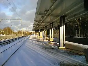 Mäkkylä is served by lines A to Leppävaara and L to Kirkkonummi on the Helsinki commuter rail network. Both lines make stops at all stations on their routes.[5] The station has a HSL ticket vending machine, as well as elevators and 55 centimetres (22 in) high platforms for accessibility.[6][1]