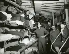 The convoy of some 40 ships came under air attack during 5 and 6 December, some ships were damaged and Torrens was credited with shooting down one attacker.[5][18] Embarked personnel collected money "in appreciation of their excellent performance shooting down the Jap dive bomber yesterday". The funds were then donated by Captain Bruu to the Norwegian consulate in San Francisco to be used for the Norwegian Destroyer Foundation.[5][note 10] The ship remained at the arrival point landing stores until 9 December when it moved about 30 nmi (35 mi; 56 km) north landing remaining troops and stores until 19 December 1944. The ship departed Leyte on 22 December stopping at Hollandia and Biak where some 1,000 members of the 55th NCB and some pilots returning to the United States embarked. With another stop at Lae where 300 wounded embarked, Torrens departed the Southwest Pacific for San Francisco on 5 January 1945 arriving 21 January. Torrens made a final voyage in the Pacific beginning in February that included some of the old ports but the newly liberated Manila by April 1945 with a return to San Francisco with stops in the by then backwaters of the Pacific war on 14 May 1945.[5][6]