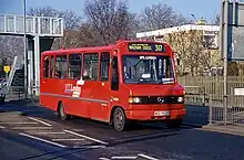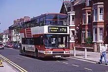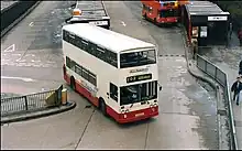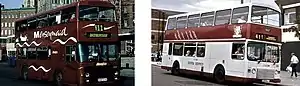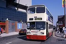 Merseymaid and Silver Service were brand names for cross-river double-deck Merseybus services between Liverpool and the Wirral via the Mersey Tunnels. Initially, a Willowbrook bodied Leyland Atlantean and five Alexander R-Type Leyland Olympians were refurbished at the Edge Lane works with soft trim, internal address systems and coach seats in November 1992, before then operating on routes 410 and 411 from Eastham to Liverpool. To attract passengers, the drivers of 'Silver Service' buses were given special customer care training, while MTL advertised a weekly ticket lower than four days' tunnel toll fees.[18] At the end of 1995, this operation was augmented with a batch of 30 similar specification Northern Counties Palatine II bodied Volvo Olympians, which were also used on other cross-river services.[16] Silver Service branding was dropped inconspicuously during 1998.