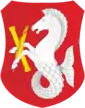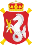 | Blazon | Gules, a hippocamp Argent holding baton and quill in saltire, all Or. |