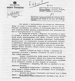 The forcible change of the ethnicity of the population was confirmed by the leader of the opposition party BZNS "Nikola Petkov" who on 30 December 1946 stated that "the population is disgusted by this outrageous violation of conscience."[48] This issue was confirmed by the ex-president of the Republic of Bulgaria Petar Stoyanov[49] and Veselin Angelov (аssoc scientist, Ph.D. in history), from the Regional Historical Museum of Blagoevgrad - where the document with the order is kept.[50]