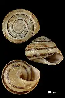 Macularia sylvatica is a medium-sized species of air-breathing dextral land snail, a terrestrial pulmonate gastropod mollusc in the family Helicidae. It was once seen as a close relative of the grove snail (Cepaea nemoralis), but does in fact not belong to the genus Cepaea at all.[1][2]