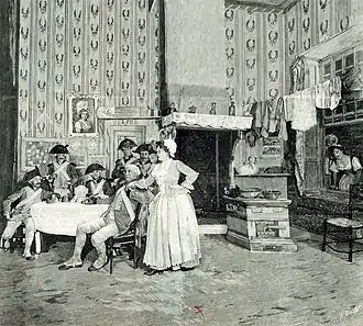 The first scene of the play is set in Catherine Hübscher's laundry in the Rue Sainte-Anne, Paris, on 10 August 1792. Catherine, who always speaks her mind, is known as "Madame Sans-Gêne" of which an approximate English translation is "Madame Without-Embarrassment". She is engaged to Sergeant Lefebvre, a member of the Revolutionary forces. She rescues a young Austrian nobleman, Count Neipperg, from the pursuing militia. Lefebvre has the chance to betray Neipperg's hidden presence, but respects Catherine's desire to protect him. Once the hue and cry has died down they help him escape.